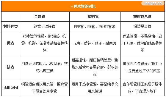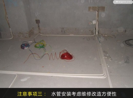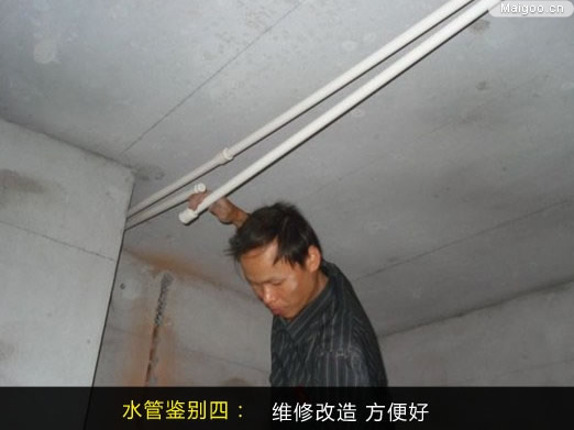 遇到管路設計不合理或使用不方便,需要維修改造,選用一種方便易于維修的水管就顯得十分重要了。目前常用的有鋁塑管和純塑料管(如PVC管、PPR管),鋁塑管能用手任意彎曲不反彈,鈕接方便,用金屬探測器很容易探測到其暗埋位置,維修簡單方便;PPR管由于熱熔連接,易脆化斷裂,維修改造會影響整個管路的安全,需要非常謹慎。施工完成之后最好對管線排布拍照留底,方便日后檢修。'