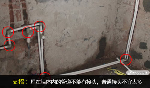 根據(jù)規(guī)定,水路管道布置時應注意:1、埋在墻體內(nèi)的管道不能有接頭;2、所開管道槽必須經(jīng)弧線平整后作防水處理;3、固定點應使用專用管卡。埋在墻體內(nèi)的管道有接頭,就是為日后漏水留下隱患。