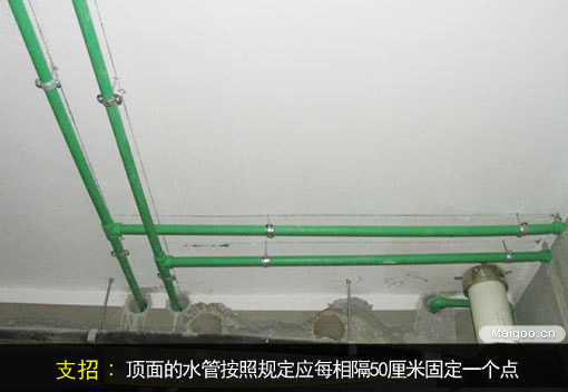 PPR水管在頂面上必須固定,按規(guī)定,應每相隔50厘米固定一個點。而且要注意,管道不能與點燈等會發(fā)熱的電器靠的太近,以免被烤化。而且,施工前應確保樓上住戶衛(wèi)生間的閉水驗收合格。