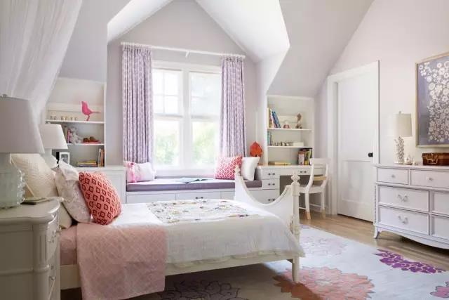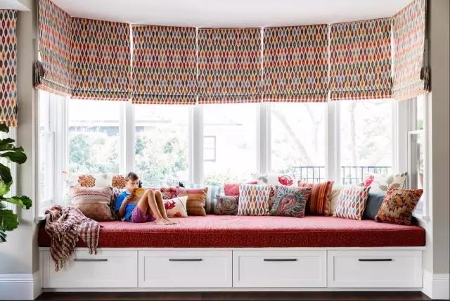 如果窗戶底部沒有墻體,面積又比較窄,保留原始形態(tài)的話有點浪費(fèi),所以就在底部設(shè)計收納柜,再鋪上彩色的小墊子,搭配小碎花的窗簾,就變成了一個充滿浪漫氛圍的小角落。