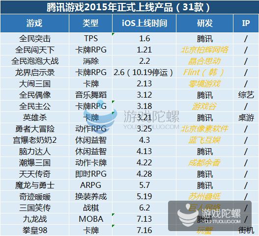 2015年騰訊發(fā)行的重點(diǎn)產(chǎn)品已經(jīng)集中在了重度類型,當(dāng)然騰訊內(nèi)部的分類沒(méi)有輕、中、重,而是按類型分,以這個(gè)標(biāo)準(zhǔn)看:卡牌、休閑、MOBA、FPS四類為主。IP類產(chǎn)品在騰訊2015的手游中表現(xiàn)十分突出。但顯然騰訊還有大量的IP產(chǎn)品和來(lái)自合作CP的產(chǎn)品。