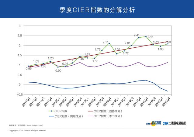接著再來看看就業(yè)行業(yè)的景氣指數(shù),根據(jù)智聯(lián)招聘聯(lián)合中國就業(yè)研究所發(fā)布的《中國就業(yè)市場景氣報告》來看,CIER指數(shù)(反映就業(yè)市場景氣度)從三季度的1.96小幅回升至2.09,也就是每個求職者對應(yīng)2.09個職位,這主要源于四季度招聘需求有所回升,而求職者面臨春節(jié),申請數(shù)量有所下降所致。剔除季節(jié)成分和趨勢成分后,僅從周期成分觀察,CIER指數(shù)全年下降,就業(yè)景氣程度持續(xù)走弱,換句話來說,未來整體就業(yè)市場依舊并不樂觀。