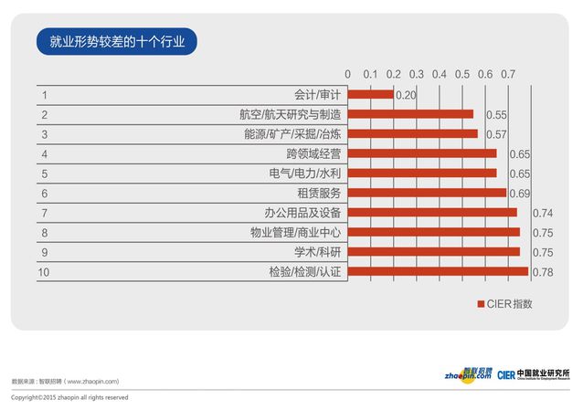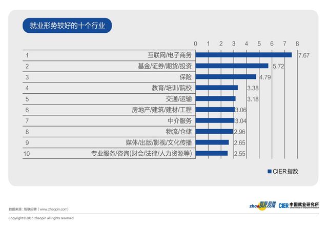 這是一個總體情況,具體到各個行業(yè)還是千差萬別,比如互聯(lián)網(wǎng)行業(yè),無論是技術(shù)工程師、設(shè)計、編輯、產(chǎn)品經(jīng)理,需求都是極大的。完全看不出來經(jīng)濟(jì)不好,宏觀經(jīng)濟(jì)走弱的一點(diǎn)點(diǎn)影子。CIER指數(shù)顯示,這個行業(yè)的崗位和人員供給比例竟然達(dá)到了7.67,一個求職者有7.67個崗位可以選擇,所以反過來說,如果你是互聯(lián)網(wǎng)行業(yè)的人才,那完全可以理直氣壯的跟老板談加薪,如果他拒絕,你完全具備跳槽的資本。