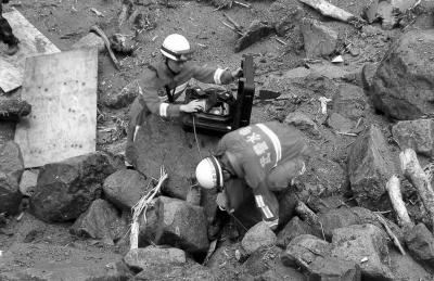 官兵利用“蛇眼生命探測儀”對任務區(qū)進行搜救(手機拍攝)。 8日5時許,福建三明市泰寧縣開善鄉(xiāng)發(fā)生山體滑坡,造成池潭水電廠一座辦公樓被沖垮、一座項目工地住宿工棚被埋壓。截至20時30分,泰寧山體滑坡失聯(lián)人數(shù)增加至41人,其中屬中國水利水電十六局35人、中國水利水電十二局6人。初步了解滑坡原因,可能是近日連續(xù)大雨所致。 □突發(fā) 大型泥石流沖毀廠區(qū)辦公大樓 7日至8日,泰寧縣普降暴雨到大暴雨,局部地區(qū)24小時降雨量達191.6毫米。8日凌晨5時左右,突發(fā)10萬立方米以上大型自然災害泥石流,泥石流沖毀了池潭水電廠擴建工程施工單位生活營地,同時沖毀了池潭水電廠廠區(qū)辦公大樓。因時值凌晨,大部分工友都在熟睡,最初統(tǒng)計有35人失聯(lián)。截至13時,已造成7人受傷。這7名工人中有兩名沒有明顯的外傷,其他5人均有不同程度的傷,一人是手外傷,一人是腳外傷,一人是腰傷,一人是髖骨骨折,還有一人是雙下肢的骨折。目前受傷的工人已經緊急送往醫(yī)院進行治療。 昨晚9時許,福建省三明市泰寧縣召開“5·8”泥石流自然地質災害新聞發(fā)布會。會上相關負責人介紹,截至晚9時,泰寧山體滑坡失聯(lián)人數(shù)增加至41人,其中屬中國水利水電十六局35人、中國水利水電十二局6人。事故發(fā)生后,新增的5名傷員不在失聯(lián)人員名單當中。目前救援仍在緊張進行。 泰寧縣旅游管委會研究決定,從5月8日7時起,泰寧縣所有景區(qū)暫時關閉。泰寧縣旅游管委會表示,請游客不要前往景區(qū),景區(qū)開放時間另行通知。 國土資源部啟動地質災害Ⅱ級應急響應 三明市泰寧縣山體滑坡發(fā)生后,國土資源部立即召開緊急會議,研究部署落實黨中央、國務院領導批示精神。國土資源部聯(lián)合民政部(國家減災委)、水利部(國家防辦)、國資委、國家安監(jiān)總局成立國務院工作組,指導地方做好救援工作。目前工作組各成員正陸續(xù)趕赴災害現(xiàn)場。 國土資源部第一時間啟動地質災害Ⅱ級應急響應,專家組趕赴災害現(xiàn)場,提供技術支持,協(xié)助指導地方政府開展地質災害應急調查。國土資源部要求福建省國土資源廳進一步了解核實災情,包括災害性質、人員傷亡等。要千方百計施救失聯(lián)人員,對災害周邊區(qū)域進行全面排查,劃定危險區(qū),加強監(jiān)測預警,嚴防二次災害。 □追問 是否大雨導致山體滑坡? 初步了解滑坡原因,可能是近日連續(xù)大雨所致。來自福建省泰寧縣政府的消息,7日至8日,泰寧縣普降暴雨到大暴雨,局部地區(qū)24小時降雨量達191.6毫米。 8日凌晨5時左右,突發(fā)10萬方以上大型自然災害泥石流,泥石流沖毀了池潭水電廠擴建工程施工單位。 失蹤的是哪些人員? 來自福建省泰寧縣政府的消息,失蹤人員參與的是池潭水電廠擴建工程,其施工單位為中水十六局、中水十二局。8日凌晨5時左右,泥石流沖毀了生活營地,及池潭水電廠廠區(qū)辦公大樓。因時值凌晨,大部分工人都在熟睡。 目前救援情況如何? 據了解,三明市組織市級和相鄰縣醫(yī)院的16輛救護車及60多名醫(yī)務人員到現(xiàn)場救援,相關醫(yī)院已安排搶救室、醫(yī)務人員和16萬毫升血液血漿等候急救;市、縣消防部隊已調集13輛車和100多名消防官兵攜帶生命探測儀等施救設備展開救援,300多名縣、鄉(xiāng)干部在現(xiàn)場參與施救,另有40余臺工程機械正趕往現(xiàn)場。 武警交通部隊迅速啟動應急預案,派出駐福州的一大隊86名專業(yè)救援兵力,攜帶推土機、挖掘機等30臺大型裝備及生命探測儀等趕赴現(xiàn)場救援;同時,武警交通指揮部、武警交通三總隊同期派出兩路應急救援技術專家組,分別從北京、合肥趕赴一線,為受災群眾和救災部隊提供技術支持和后勤保障。 8日下午5時許,記者隨武警部隊徒步到達事發(fā)現(xiàn)場,看到武警、消防官兵及當?shù)鼐仍α康任辶偃苏诰o張施救,十多輛挖掘機在現(xiàn)場挖掘。 事故現(xiàn)場地面上隨處可見大石頭、泥土,以及彎曲的鋼筋,搜救犬正在搜尋失聯(lián)人員。據現(xiàn)場的武警戰(zhàn)士介紹,武警部隊采取機械加人工的辦法,正在現(xiàn)場積極展開救援。在事故現(xiàn)場,停著十多輛救護車和部隊車輛,隨時準備救援。目前,雨時斷時續(xù),給救援帶來了很大的困難。