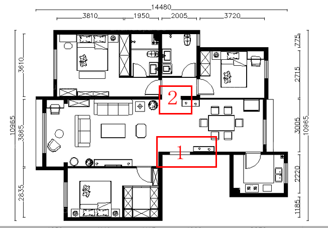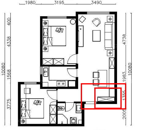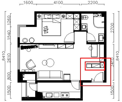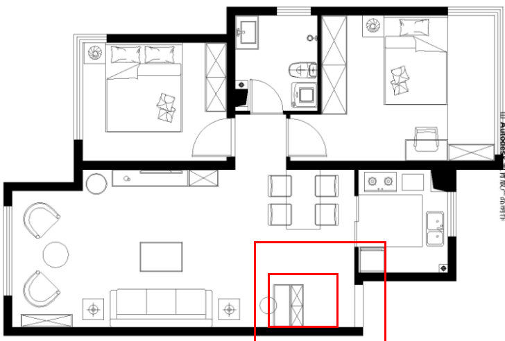 在中小戶型里,這是一種較常見的沒玄關(guān)類型,對(duì)中小戶型來(lái)說(shuō),玄關(guān)處又是一個(gè)比較重要收納空間。因而,需要設(shè)法打造一個(gè)。設(shè)計(jì)師最常用的就是靠墻做一個(gè)鞋柜(上圖小紅框),省時(shí)省力省事,也能滿足業(yè)主一般需求。