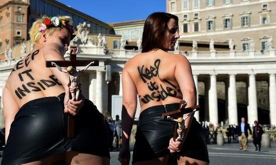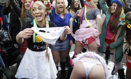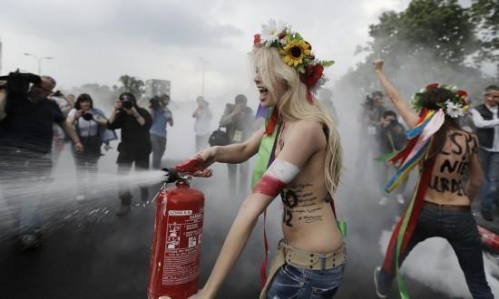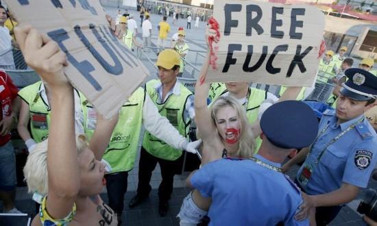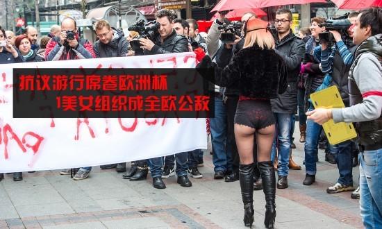 嘗到甜頭后,她們開始頻繁在歐洲杯的重要時(shí)間節(jié)點(diǎn)出現(xiàn):2011年6月,她們在身上著“2012歐洲杯拒絕賣淫”,攪亂了歐洲杯倒計(jì)時(shí)一周年活動(dòng);7月,她們身涂彩繪,手捧足球,在噴泉中洗浴抗議烏克蘭可能因?yàn)橥獾厍蛎源罅坑咳攵鴷和>用裣募緹崴?yīng)……