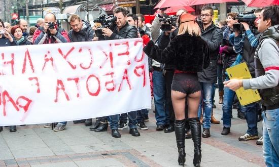 2012歐洲杯期間,又有一大批東歐妓女從西歐和鄰國涌向?yàn)蹩颂m和波蘭。為了吸引來自西歐的闊綽球迷,這些性工作者準(zhǔn)備充分,補(bǔ)習(xí)了16個(gè)國家的歷史和足球知識。色情場所也花費(fèi)巨額資金進(jìn)行裝修,以便讓球迷能邊享樂邊看球。圖為抗議性工作的費(fèi)曼成員被抓走。