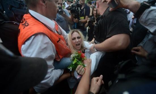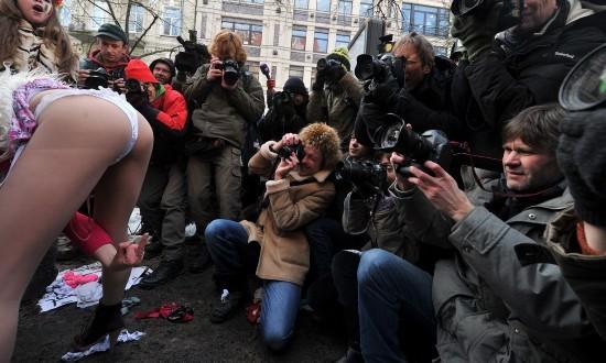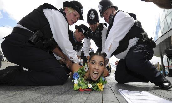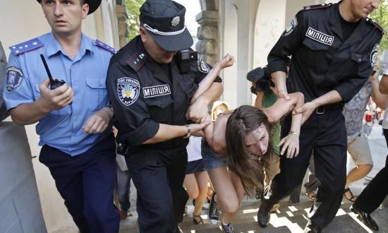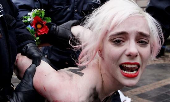 由于在公共場所裸露是烏克蘭法律所禁止的行為,對費(fèi)曼成員來說短暫被拘和罰款一點(diǎn)都不稀奇。她們和警察之間的追逃游戲,以及警察強(qiáng)行遮住她們的胸部的畫面,都是歐洲各國攝影記者渴求的“好題材”。