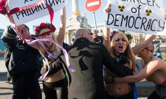 在基輔,每天都有集會,總有人拿著擴(kuò)音器吶喊,總有人揮舞旗幟,組織各種規(guī)模的抗議。有媒體形容該組織“一脫成名”,也有媒體稱其為“民權(quán)斗士”。以身體作為政治抗?fàn)幍奈淦?這種出位行為招致不少爭議。但漢娜認(rèn)為,惟一讓她們的訴求被聽見的方法,就是“脫掉衣服”。