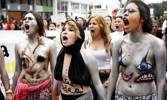 關(guān)于“袒胸露乳”的號召在社交網(wǎng)上不脛而走,其支持者和確認(rèn)參加者已達(dá)8000人,很多人上街游行,其中包括很大一部分準(zhǔn)備為世界杯服務(wù)的巴西妓女,有游行者甚至拿避孕套吹泡泡以抗議。
