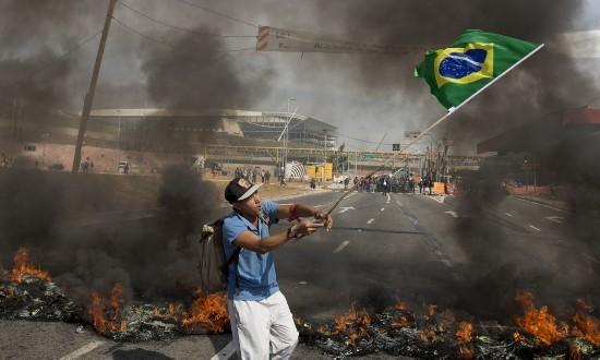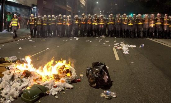 在圣保羅,5000名工人走上街頭,走到世界杯揭幕戰(zhàn)(6月12日巴西VS克羅地亞)的科林蒂安球場前焚燒輪胎,警察向其發(fā)射催淚瓦斯和橡皮子彈。