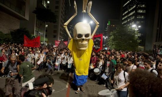 圣保羅當(dāng)?shù)貢r(shí)間2014年5月15日,巴西世界杯抵制活動(dòng)升級,抗議者裝扮成骷髏挑釁,還焚燒物品,火光沖天。當(dāng)時(shí)距離世界杯開幕僅有一個(gè)月,巴西當(dāng)?shù)氐目棺h行動(dòng)卻愈演愈烈,民眾們走上街頭,再次針對世界杯的巨大成本進(jìn)行抗議。