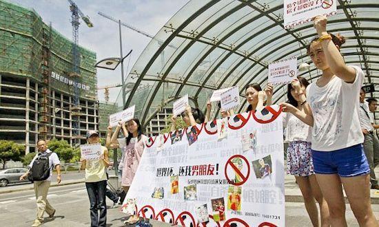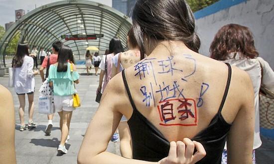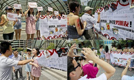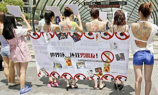 她們在世紀(jì)大道地鐵站外、人民公園外和美羅城外抗議,舉牌號召“世界杯,還我男朋友”,還寫上了各種各樣控訴“標(biāo)語”,例如“別拿你的WorldCup挑戰(zhàn)我的ECup”、“輸球了別拉我自殺”、“在辦公室談足球的男人都是娘娘腔”、“家庭主婦≠足球怨婦”和“我要生了!老公你在哪里?”。