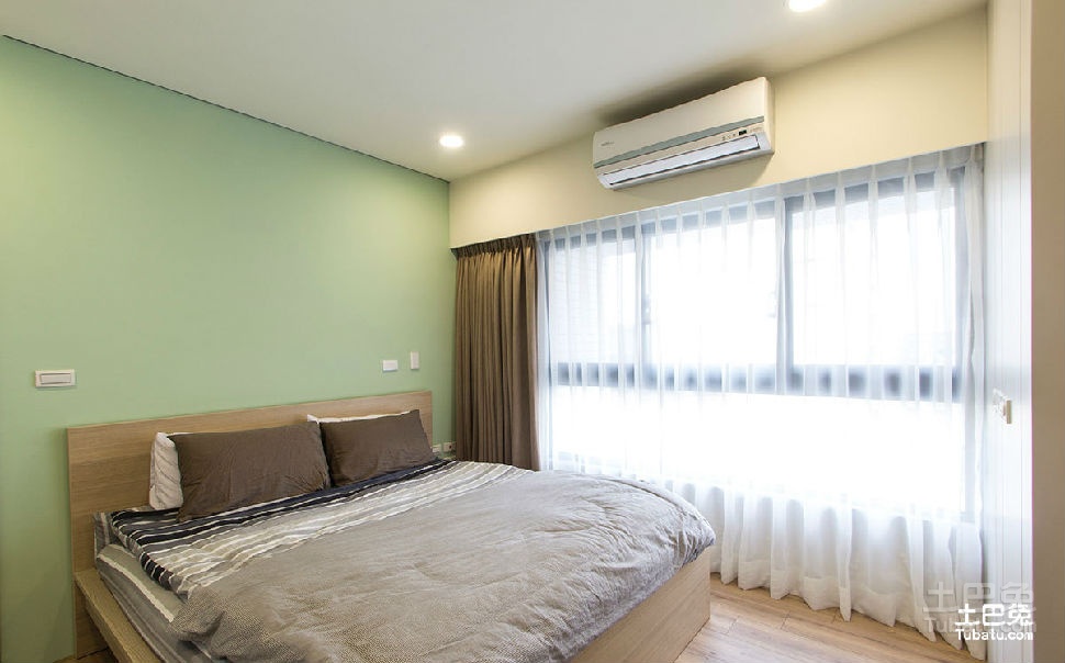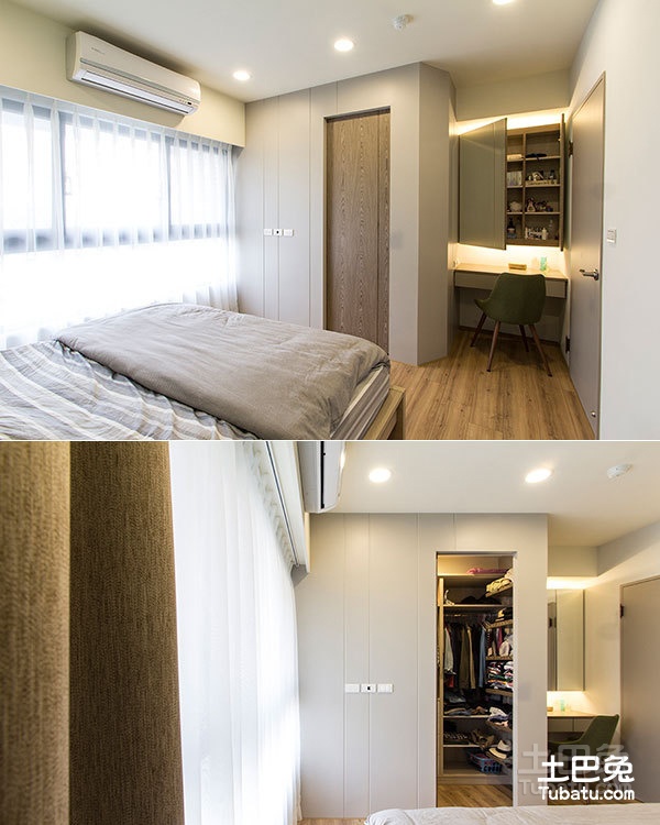 因應(yīng)主臥房的狹長格局,將化妝臺與更衣間安排至同一面向,讓寢具放置更為寬敞,搭配床頭背墻的草綠跳色,圍塑睡眠時的放松氛圍。
